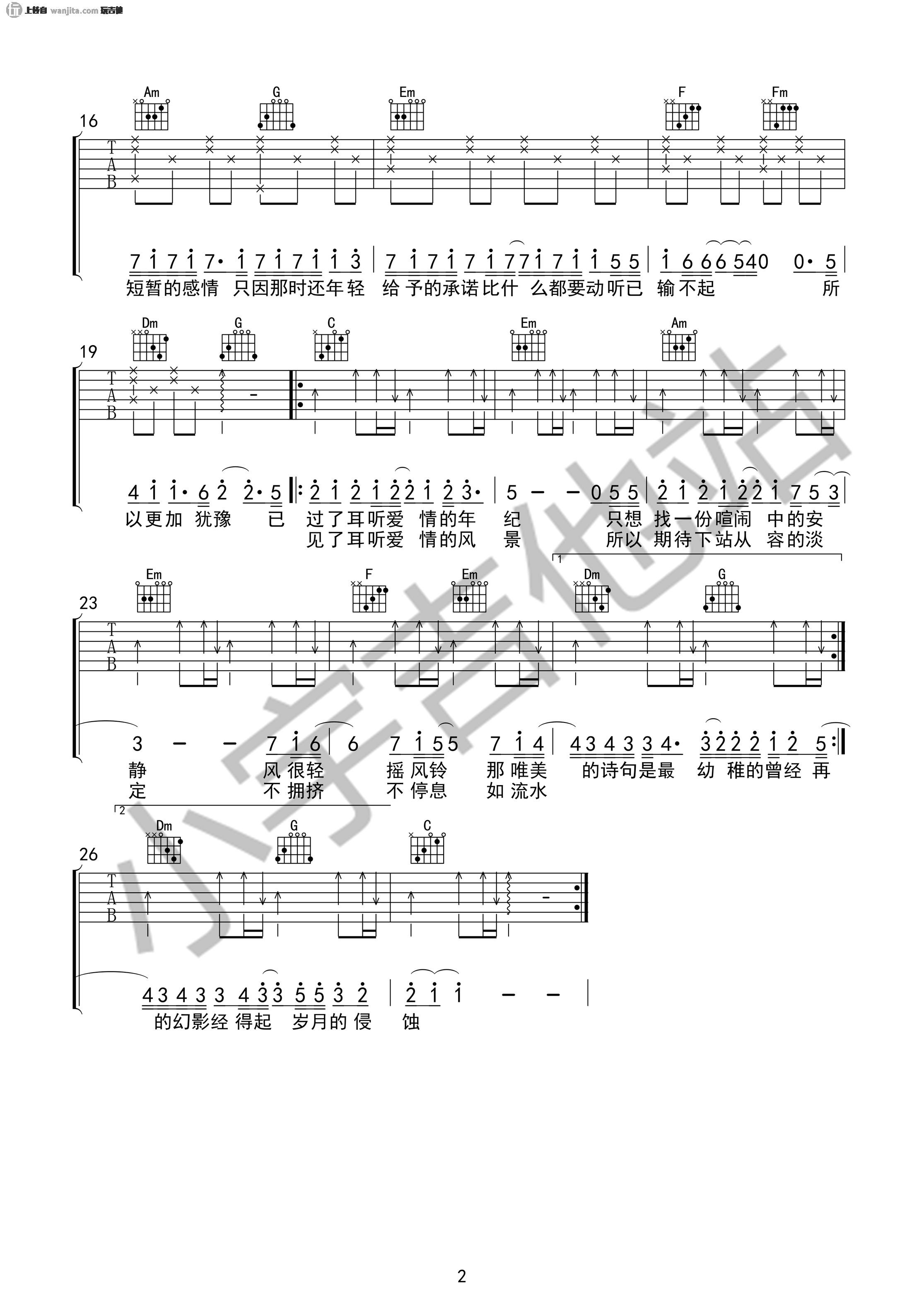 - 歌曲中使用了较多的和弦,弹唱时要注意和弦的准确转换,保持和弦的连贯性。