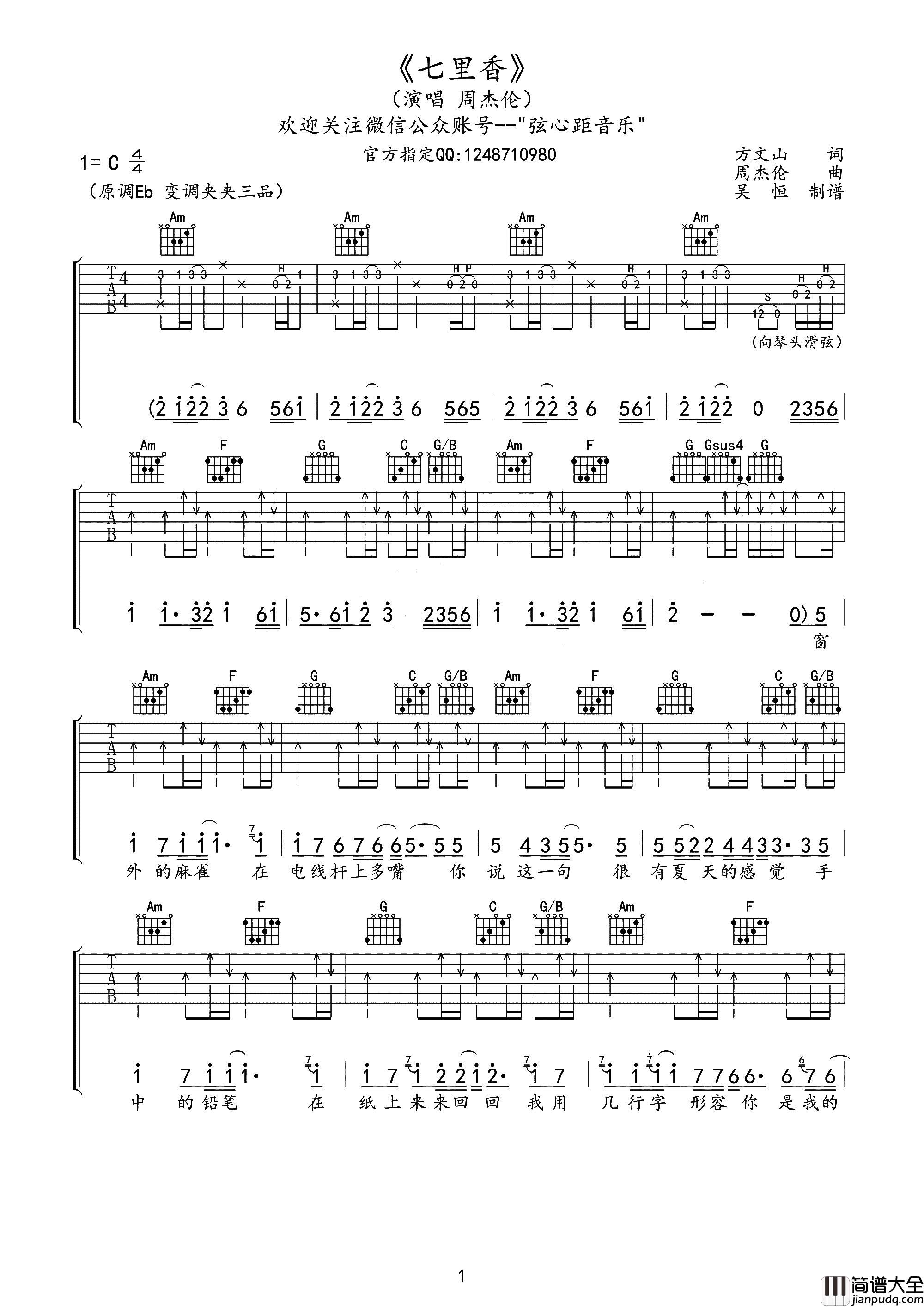 2. "和弦转换":《七里香》的和弦转换较为频繁,需要练习和弦的流畅转换,避免生硬的跳跃。