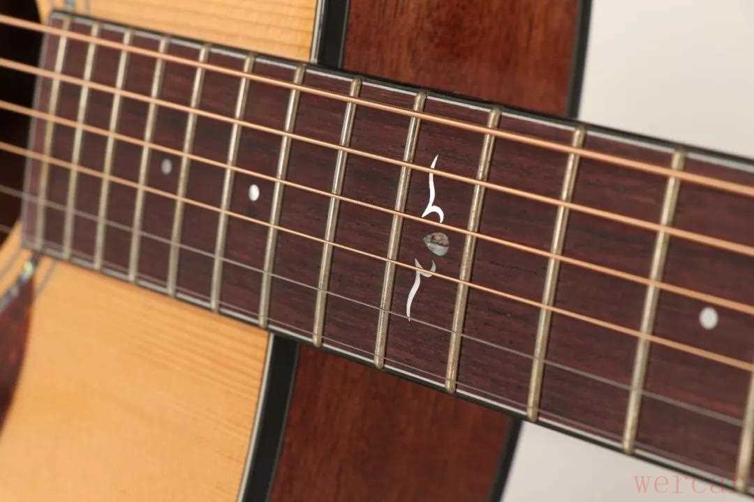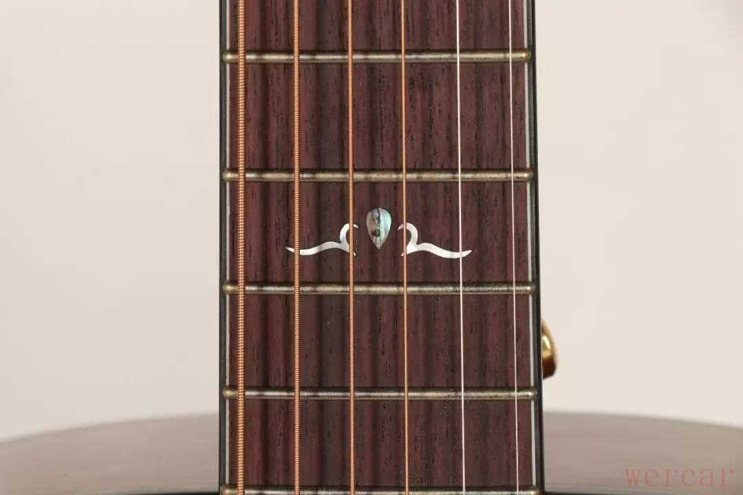 琴头、指板、琴桥处均有珍珠贝镶嵌的流线/树叶花纹,音孔圈处的鲍贝流光溢彩,光是这几处细节,就能让人觉得手中的毛爷爷在发光了。