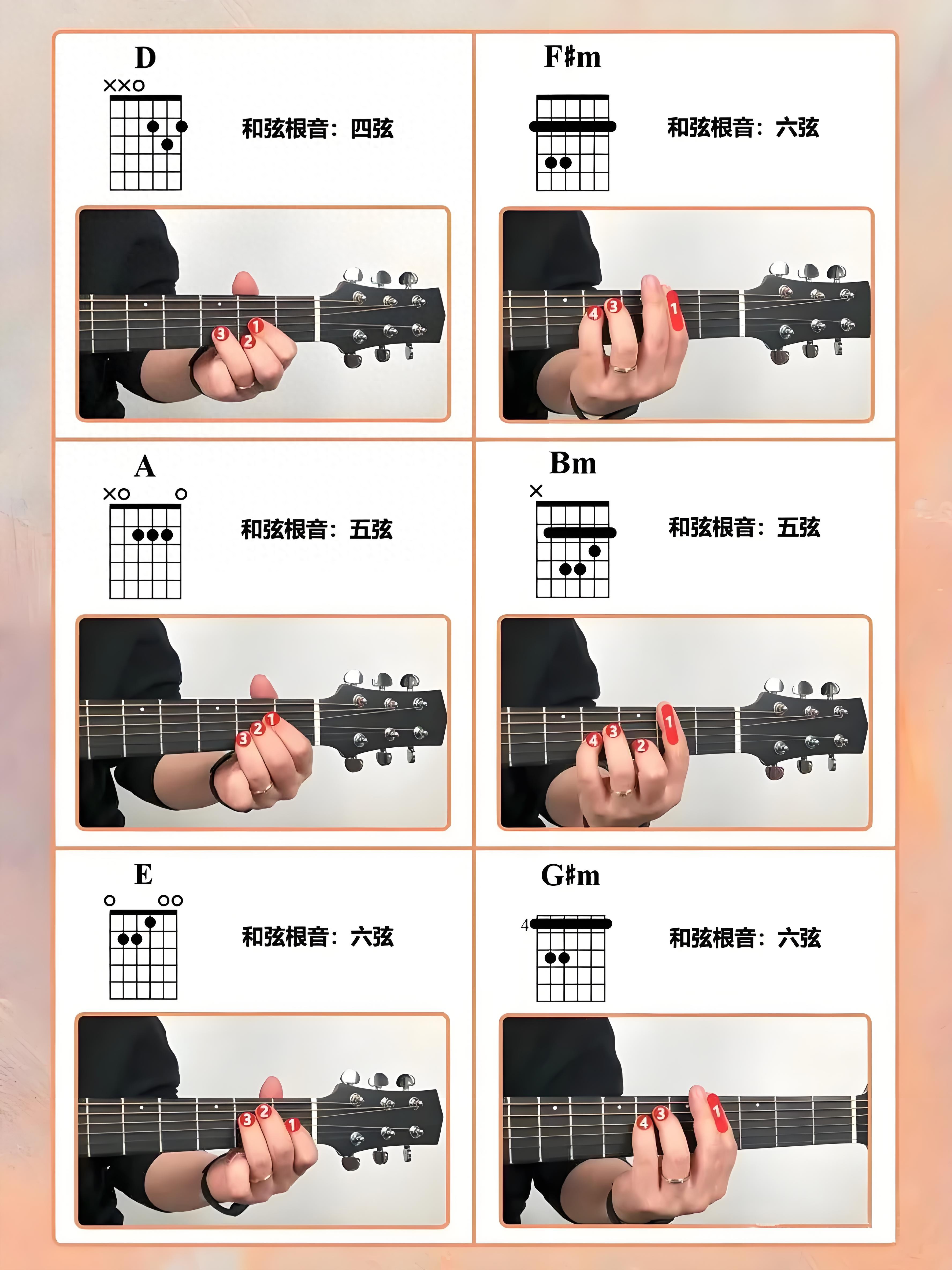 - "G和弦":使用食指按住6弦2品,中指按住5弦3品,无名指按住4弦0品。