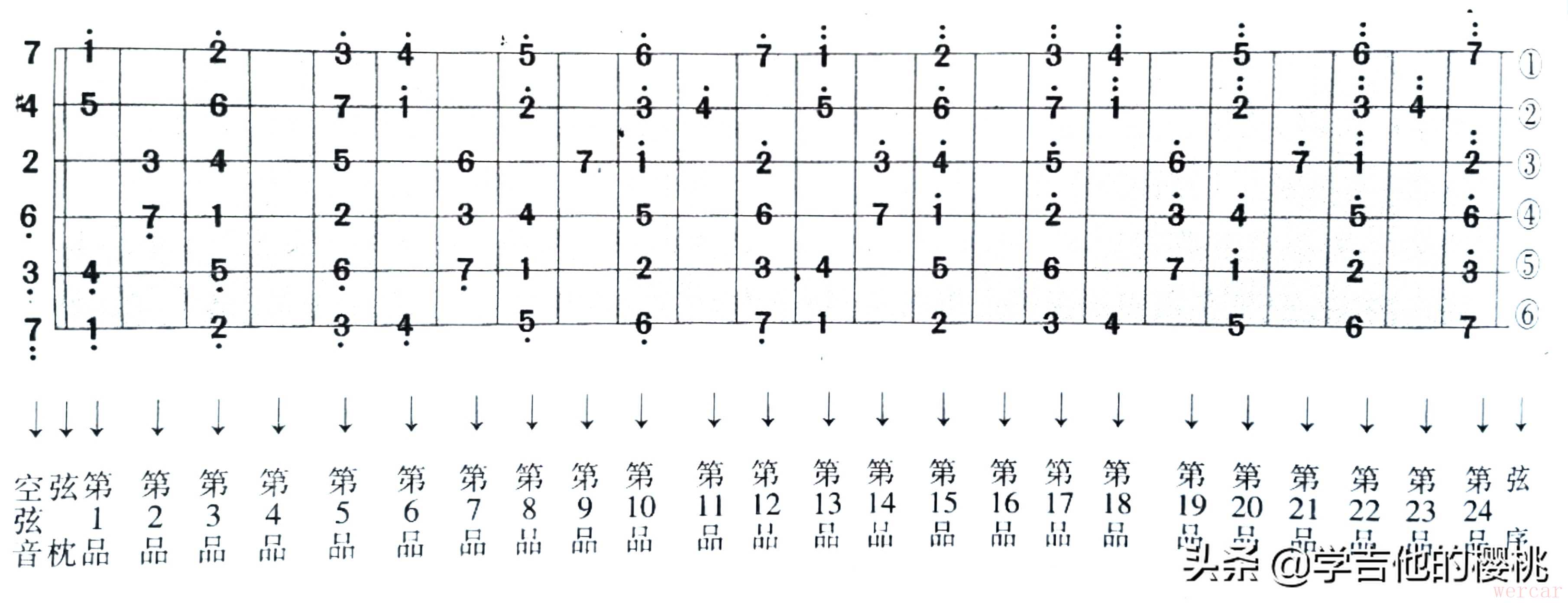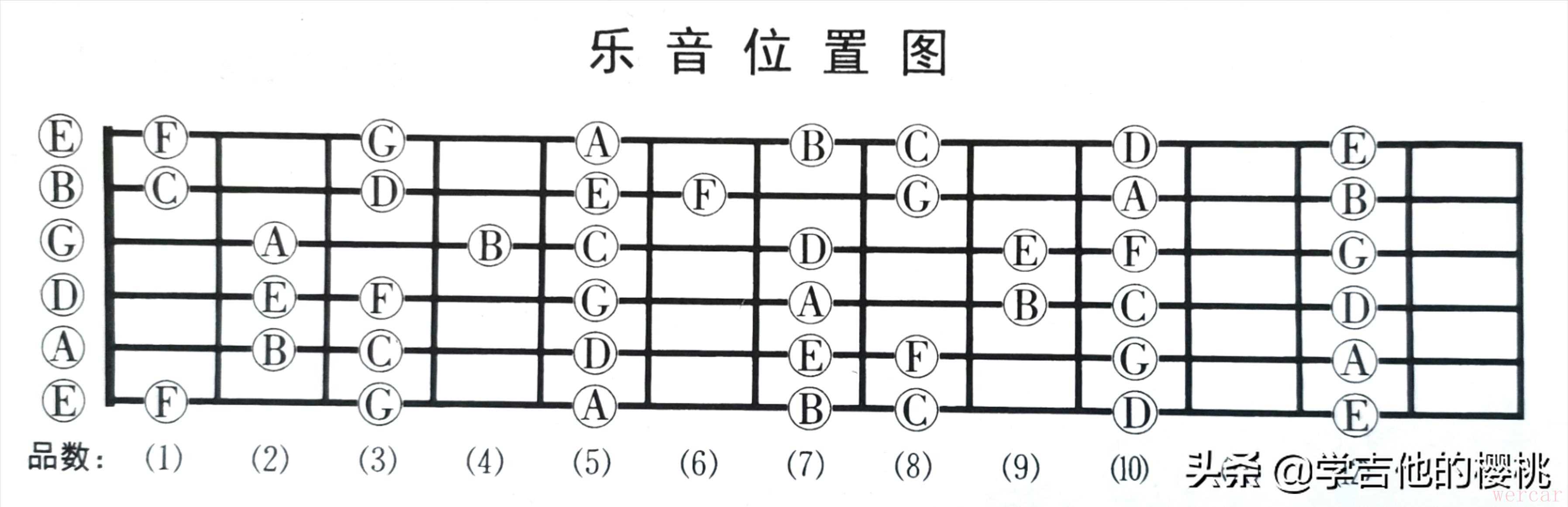 或者空弦音确定以后,根据吉他指板音的特点:相邻两个品格之间是半音关系,隔开一个品格之间是全音关系,然后进行推算。注意在各级指板音位图中的B需要往前挪一格变成bB。