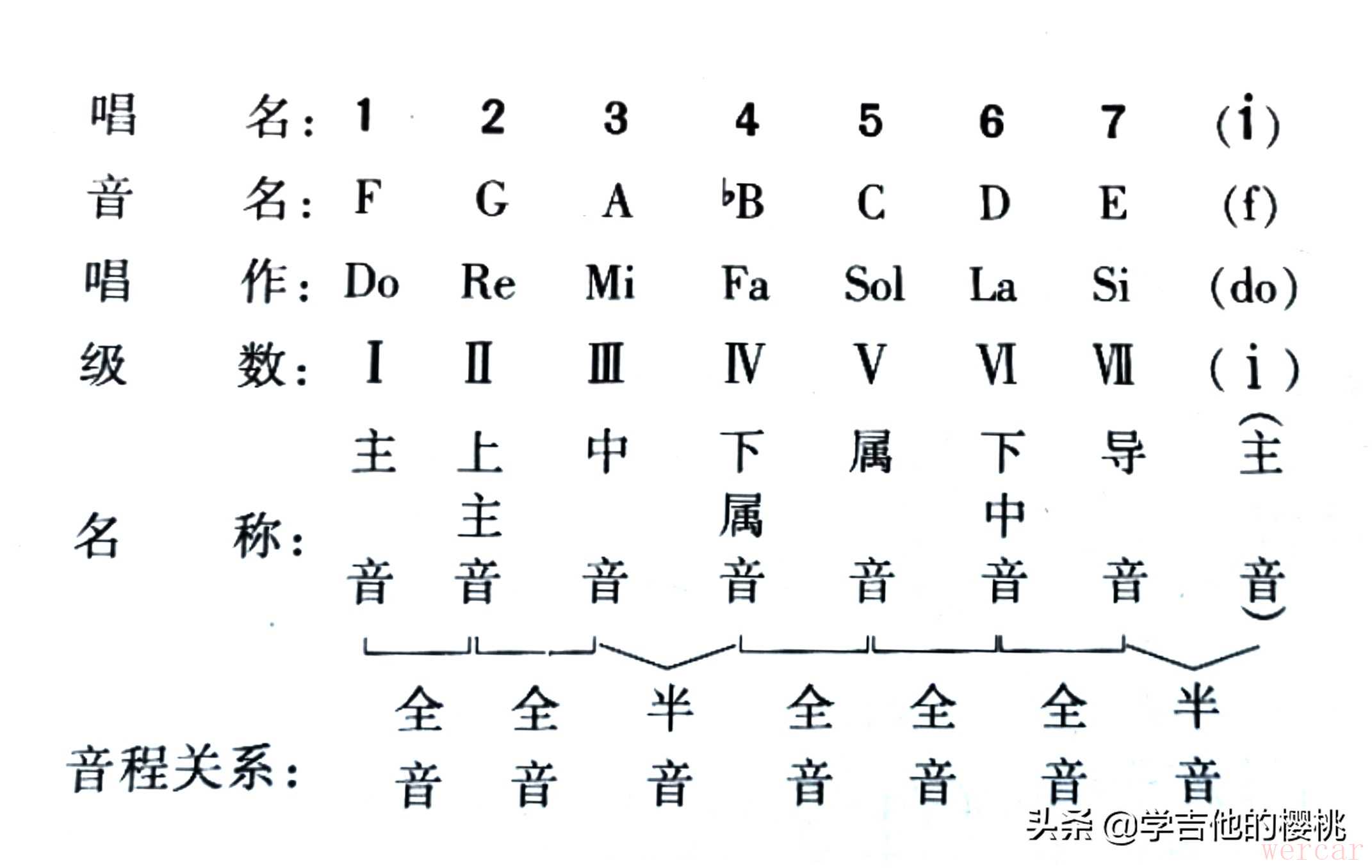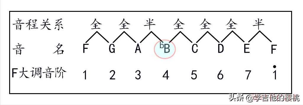 又因为大调音阶的音程关系是:全--全--半--全--全--全--半,所以排列后产生了F大调音阶。