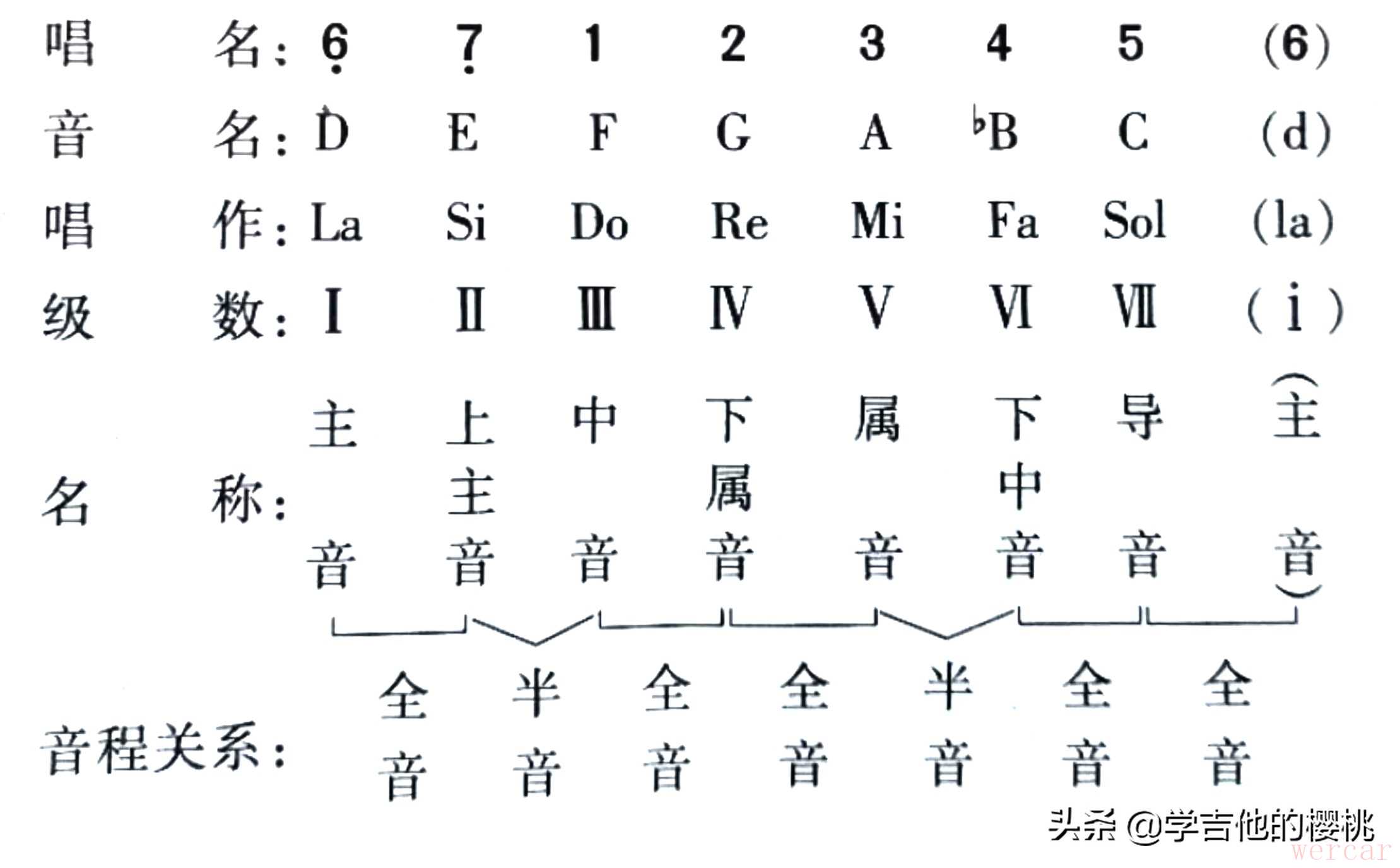 "大调音阶 (Major Scale):" 构成方式是全全半全全全半 (W W H W W W H,W=全音,H=半音)。听起来比较明亮、快乐。