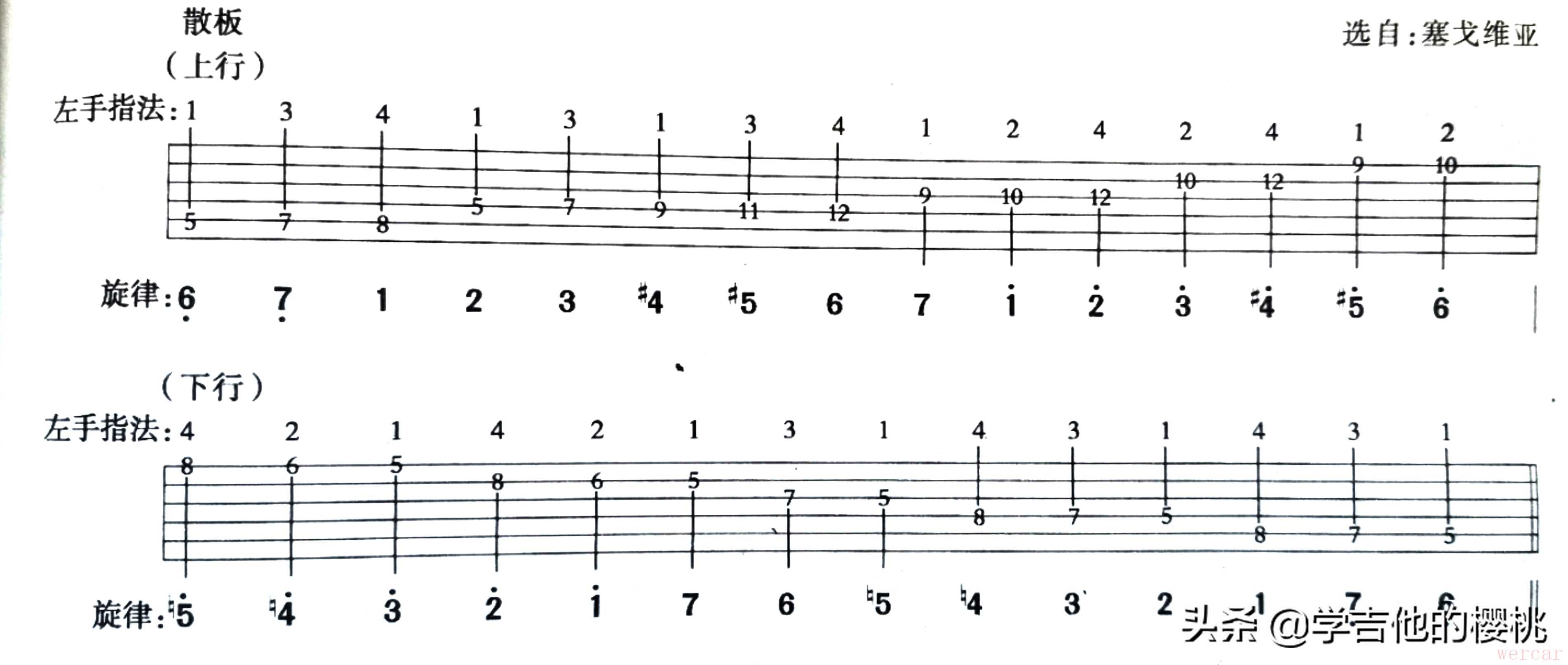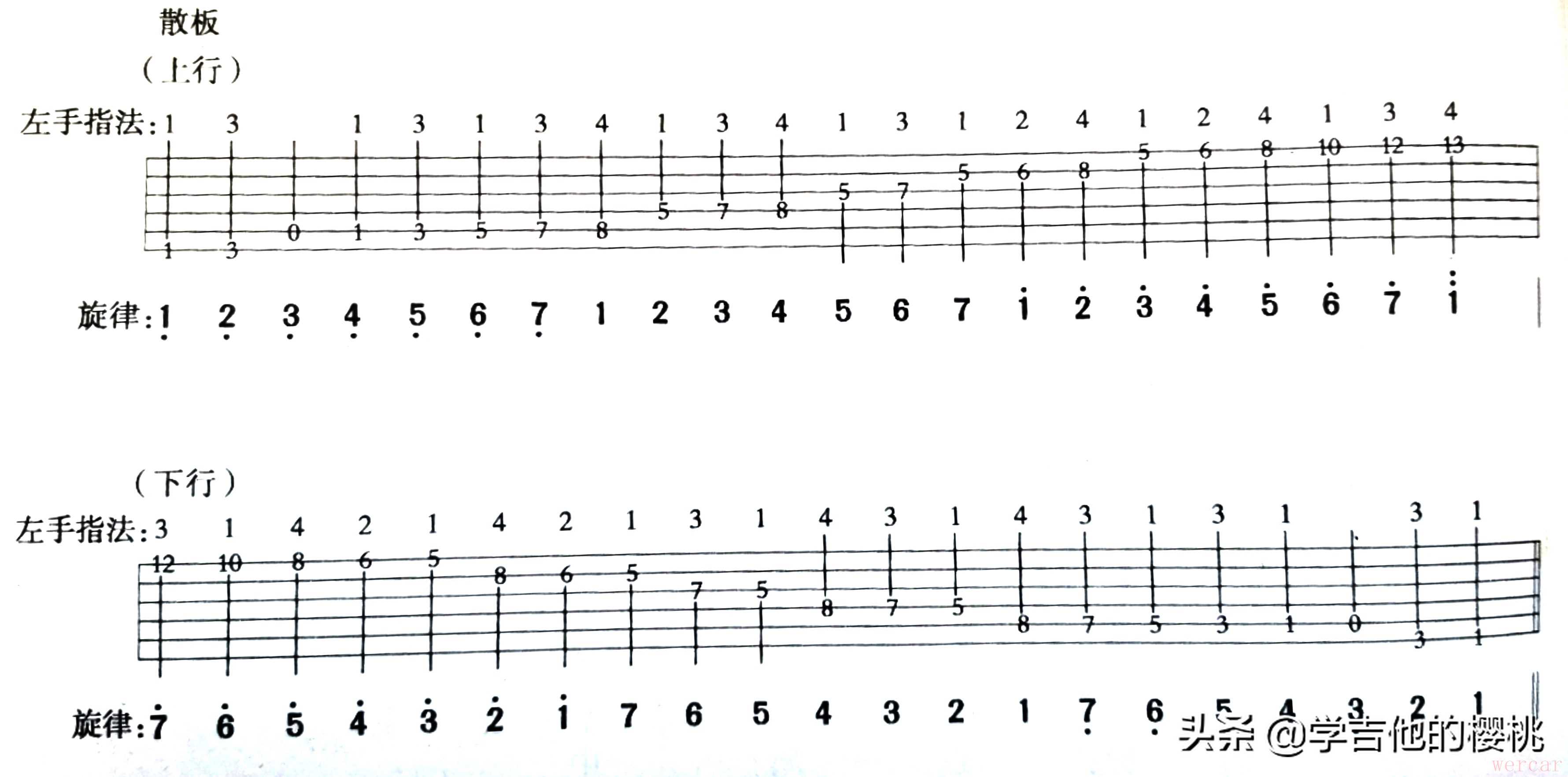 4、上图音阶练习中,左手指法的数字指的是按弦手指。左手食指=1,左右中指=2,左手无名指=3,左手小指=4。六线谱线上的数字表示品位,例如线上数字1,就表示按1品。线上数字所在的位置表示按几弦。举例:F大调的低音1,左手指法是1,六线谱上数字是1并位于6弦,所以左手用食指按住1品6弦。右手相应进行弹奏。