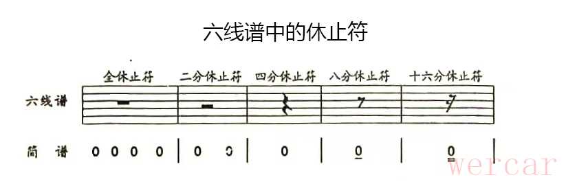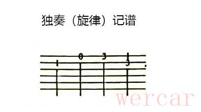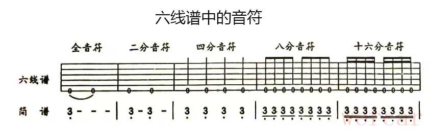 由下面两图可以发现,六线谱中使用音符、休止符与五线谱的音符、休止符是基本一致的 同时,六线谱中的附点音符、延音线等记号,也与用五线谱基本相同,与简谱也基本一致。