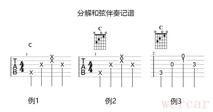 分解和弦伴奏的记谱,如上面三种。例一最简洁,例三最完善清楚。例三上面既显示了和弦的名称和指法图,也在谱线上用数字标明了音符所在的品位,非常适合初学者,也是现在最常见的记谱形式。