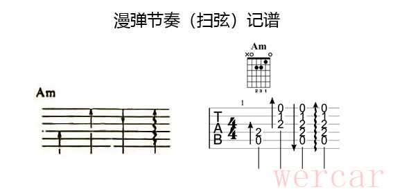 然后,第一拍,右手自上而下扫弹⑥⑤④弦;第二拍,右手自上而下扫弹③②①弦;第三拍,右手自下而上扫弹③②①弦;第四拍,右快速顺次从⑥弦拨到①弦,称为琶音。