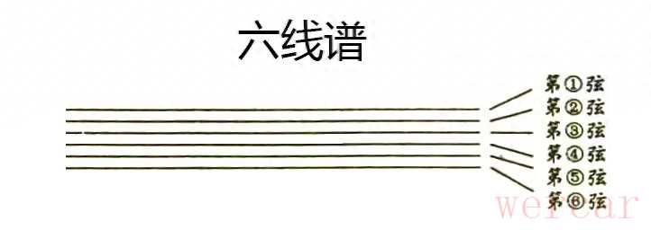 六线谱的六条平行线与吉他的六根弦相对应,如上图,用线上的音符来表示左手按弦的位置和右手的拨弦。六线谱常常与简谱或五线谱、和弦图相结合,一起记录音乐的曲谱。