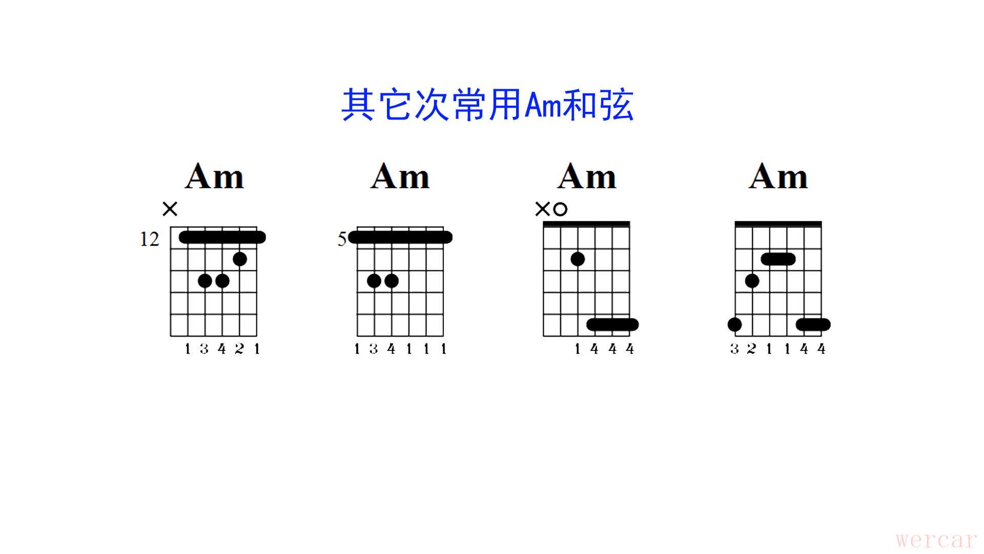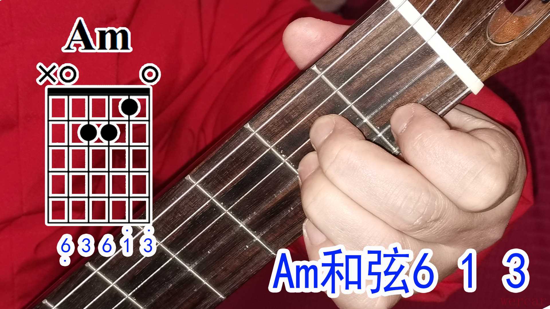 Am和弦(A minor,A小调的根音和弦)除了最基础的按法(食指按第1品E弦,中指按第2品C弦,无名指按第3品G弦,大横按按住所有6弦)之外,确实有几种变体或替代按法,它们可能在转调、避免大横按困难或声音更清晰时更有用。