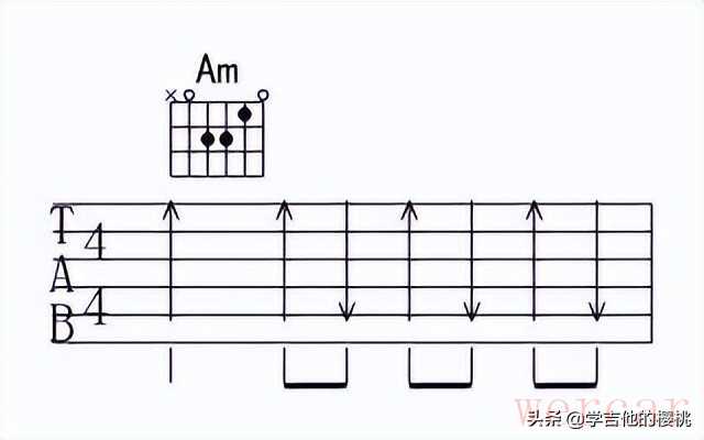 扫弦节奏记谱:在六条线上有朝上或者朝下箭头,此时六线谱上方也有左手指法的提示,左手按弦,右手根据朝上的箭头就往上扫,朝下的往下扫。