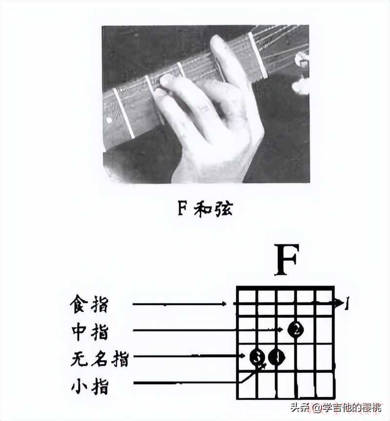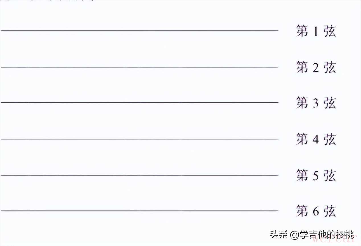 和弦图中从左向右竖直的线条分别表示6弦(最粗的弦)、5弦、4弦、3弦、2弦、1弦(最细的弦)我们所见的和弦图其实就是我们所看到把吉他竖直时吉他品位中的一部分,大家参看此图即可明白。
