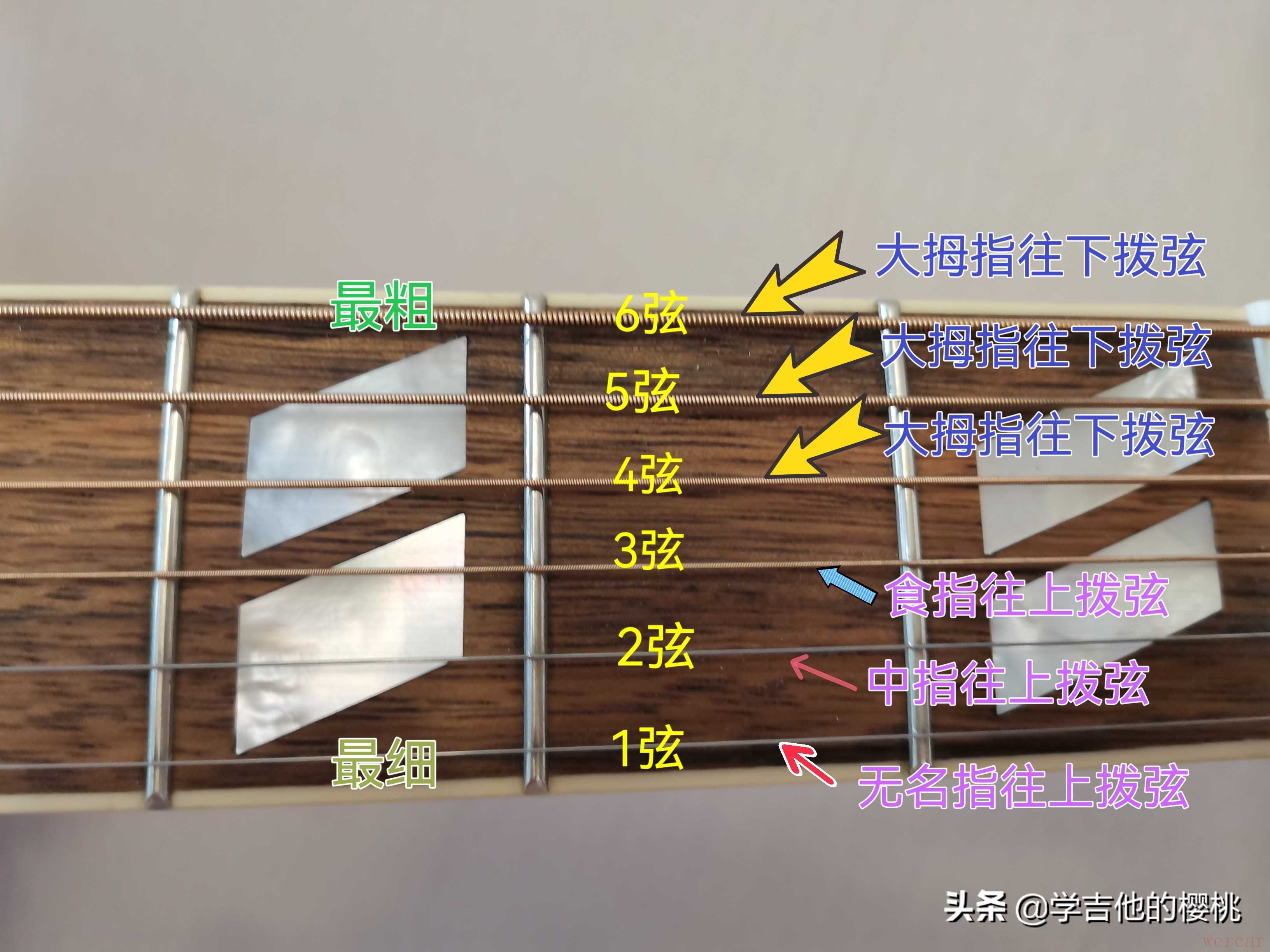弹奏的过程中,右手大拇指负责6/5/4弦,往下拨弦;右手食指负责3弦,·往上拨弦;右手中指负责2弦,往上拨弦;右手无名指负责1弦,往上拨弦。