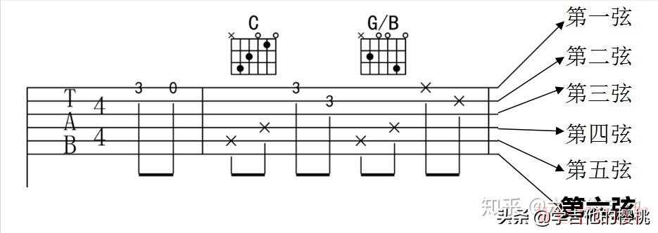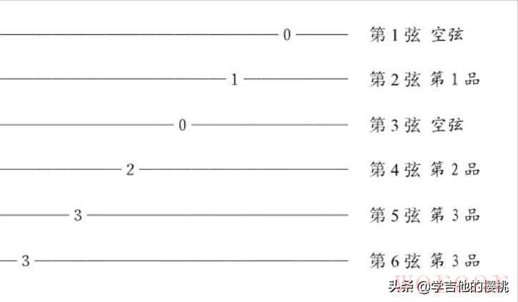 对应TAB谱中,最上面的弦是1弦,最下面的是6弦。