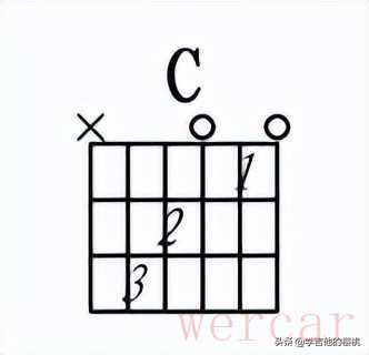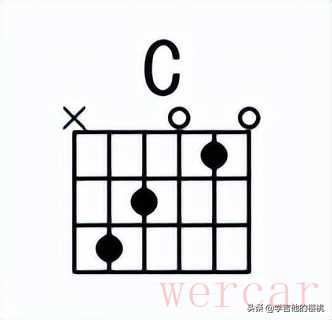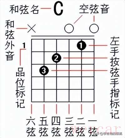 和弦图最上方标注字母表示吉他和弦的和弦名,和弦名下方x标记是和弦外音,在弹奏此和弦时不需要弹此弦,和弦名下方o标记空弦音,即表示不要按弦时弹响的音。和弦左侧数字1是品位标记,1表示1品、如果是2则表示是2品,其他数字一次类推即可。