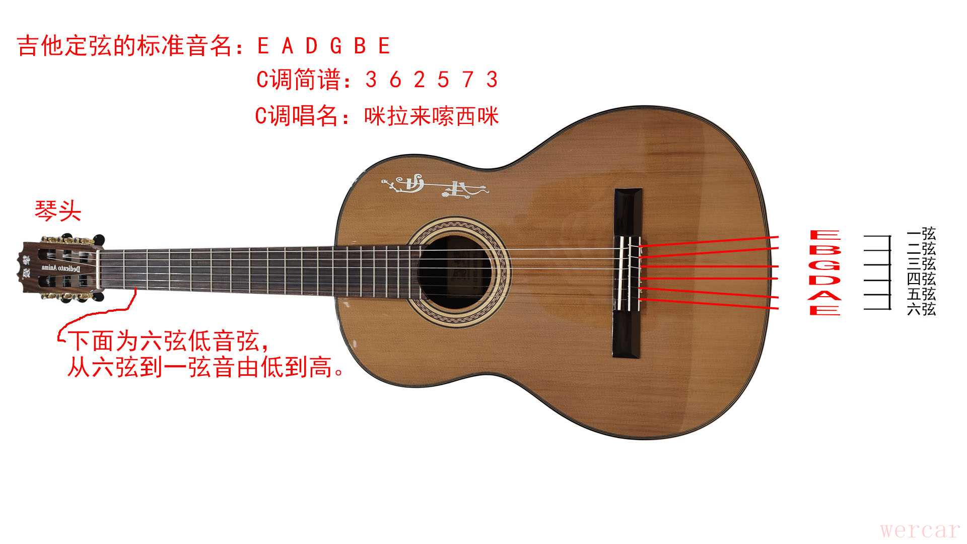 2、吉他实物图示:从低音弦到高音弦的吉他音名为 E A D G B E,如下图所示。