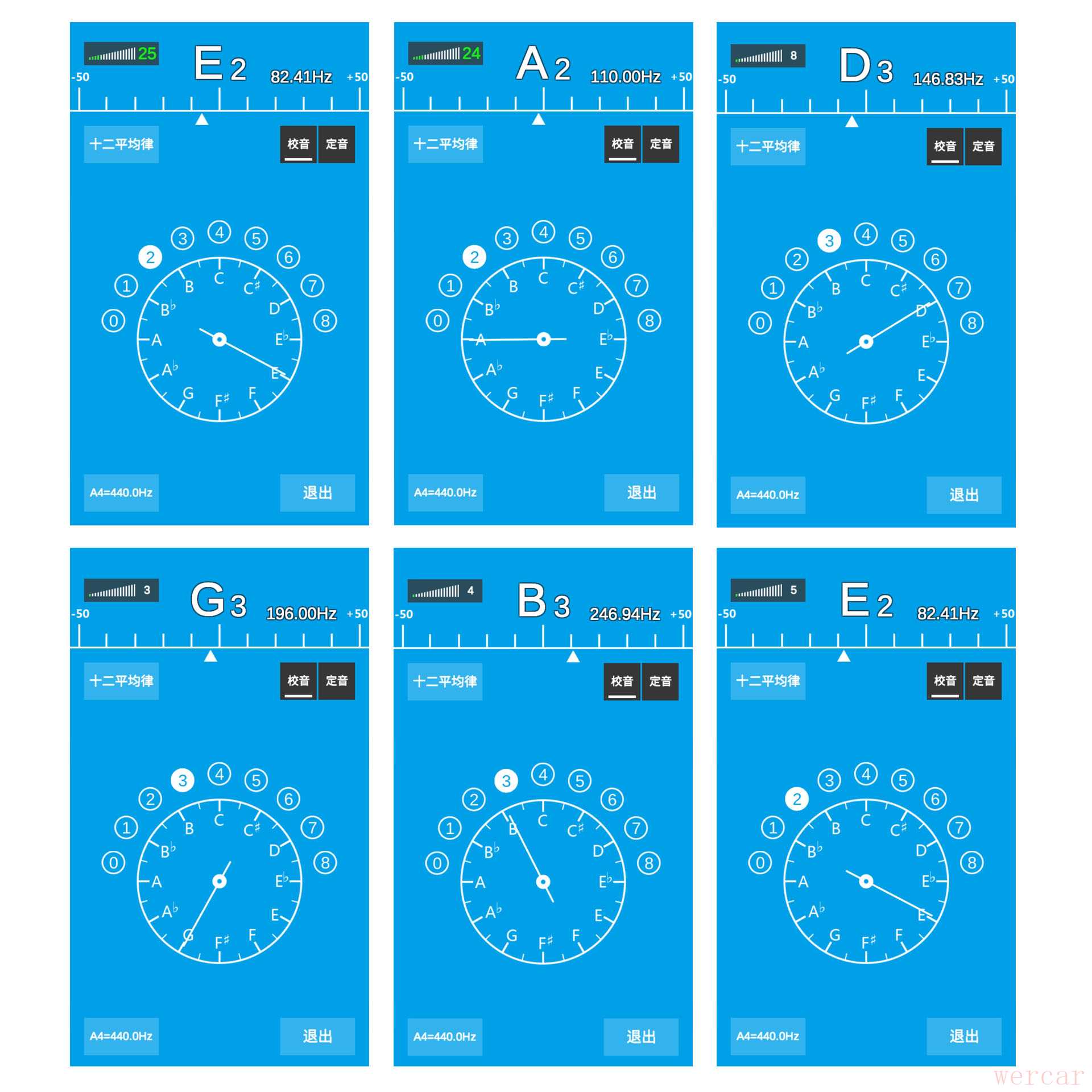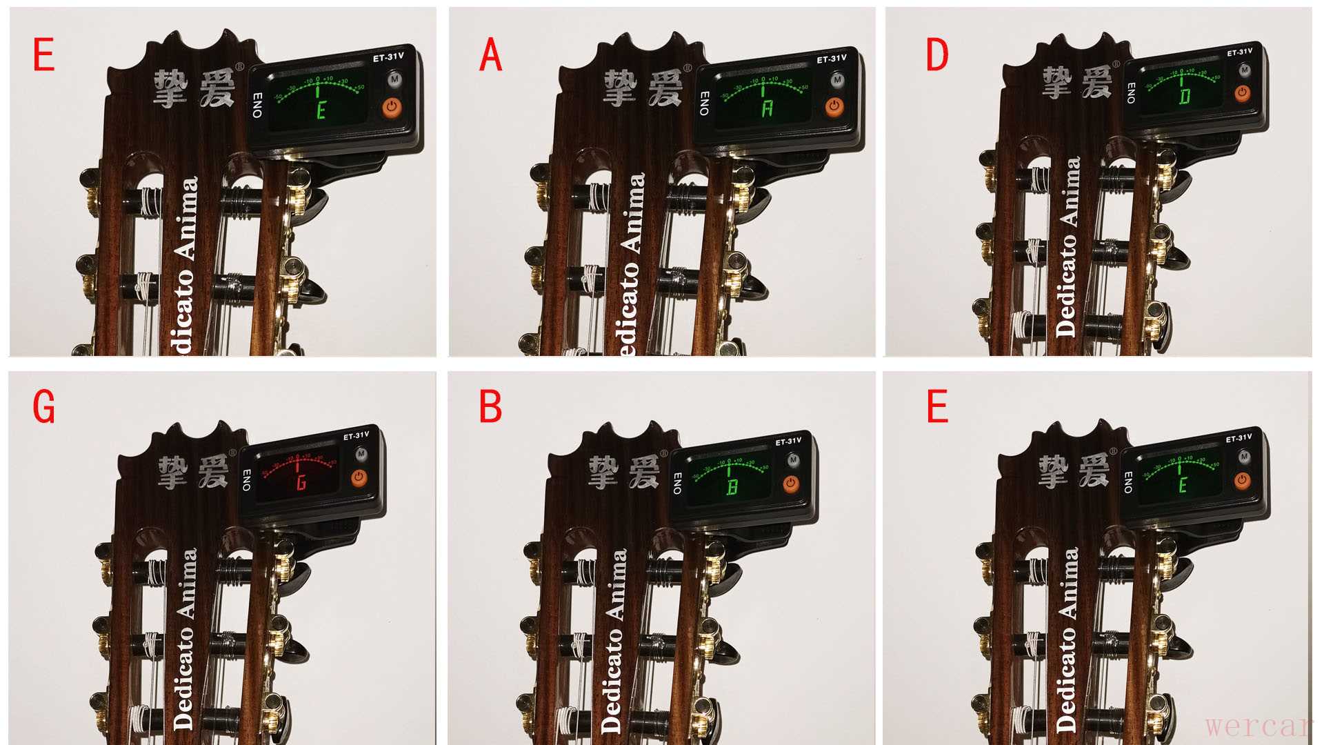 此方法直观简便,就是需要去购买一个,按前面第一点说的规律。用电子调音器夹住琴头,然后拨第六弦。调音器显示如下图左上为E就调好了。