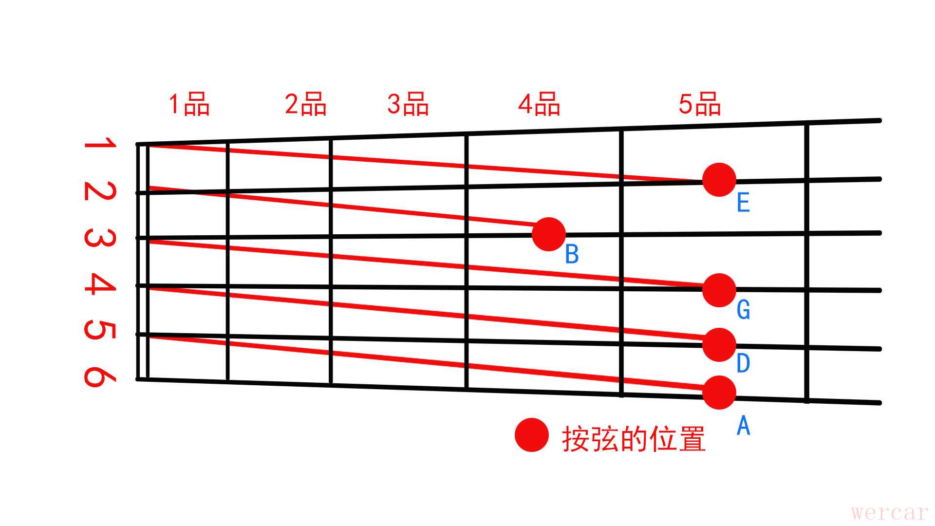 这个上图中。如第六弦按住第五品。音名为A和第五弦空弦音名一样,先确定这个A音。然后根据上图规律调好六弦和五弦。