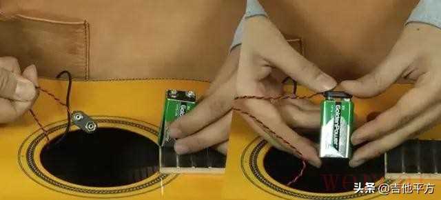 首先把电池连接好。放入电池包中。然后撕下电池包反面的背胶,把电池包粘贴在琴体内部建议粘在琴颈和琴体连接处的木块上,如果您的琴在这个位置上有LOGO或者编码,那么还可以粘在琴体内部侧板的位置。