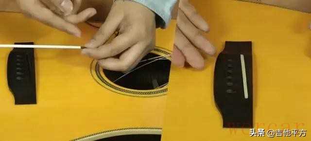 首先把外部的保护套管取下,然后从琴体内部把压感条头部的辅助安装软条从我们刚才开好的孔中穿出,拽出来,然后把压感条的金属部分装进琴桥的凹槽当中,固定好。最后装回琴桥就大功告成了。
