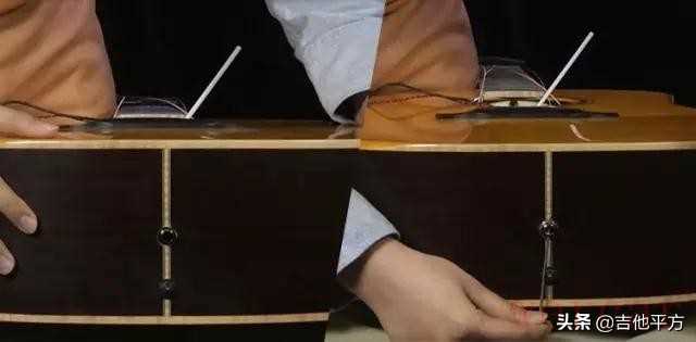 首先从附件包当中取出3m胶贴,撕下背胶,然后把调节旋钮粘在音空内部就可以,这里要注意,由于不同型号的吉他内部音梁结构不同,所以没有固定的位置,找一个合适的位置贴好就可以。
