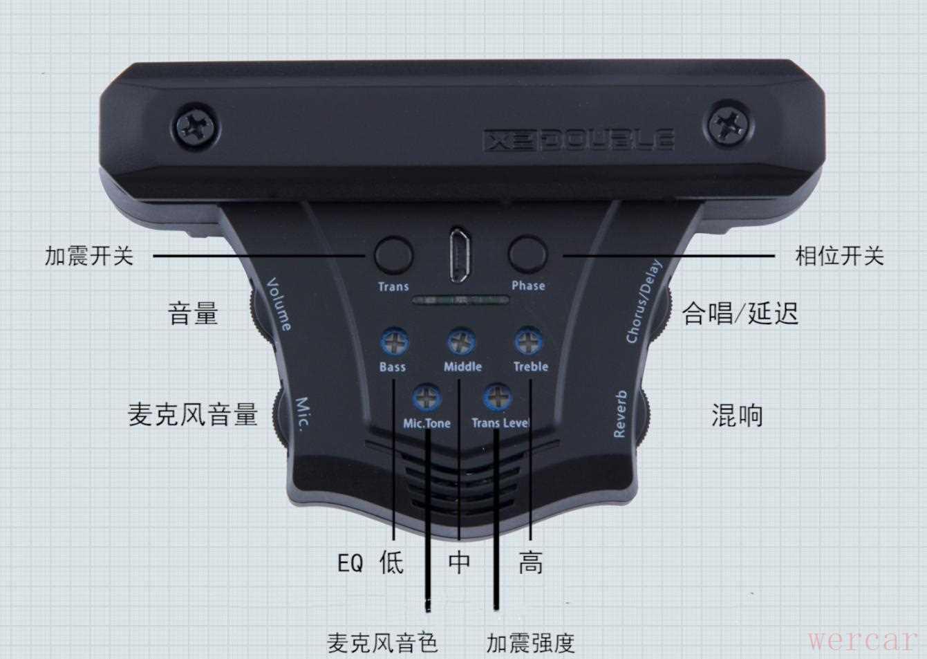 拾音器下半部分是一个集成元件。外圈的调节旋钮从上到下、从左到右分别为音量、麦克风音量、合唱/延迟、混响调节,属于效果调节。