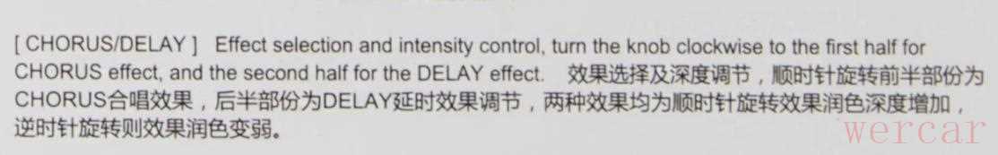 这里有一个小小的缺陷,就是按照说明书,合唱/延时,也就是chorus/delay旋钮按顺时针方向进行切换,在对应的旋转范围内,顺时针效果变大,逆时针效果变小。但在拾音器上,chorus/delay的印刷方向却与说明书的方向相反,呈逆时针。这样会很容易造成用户的误解。