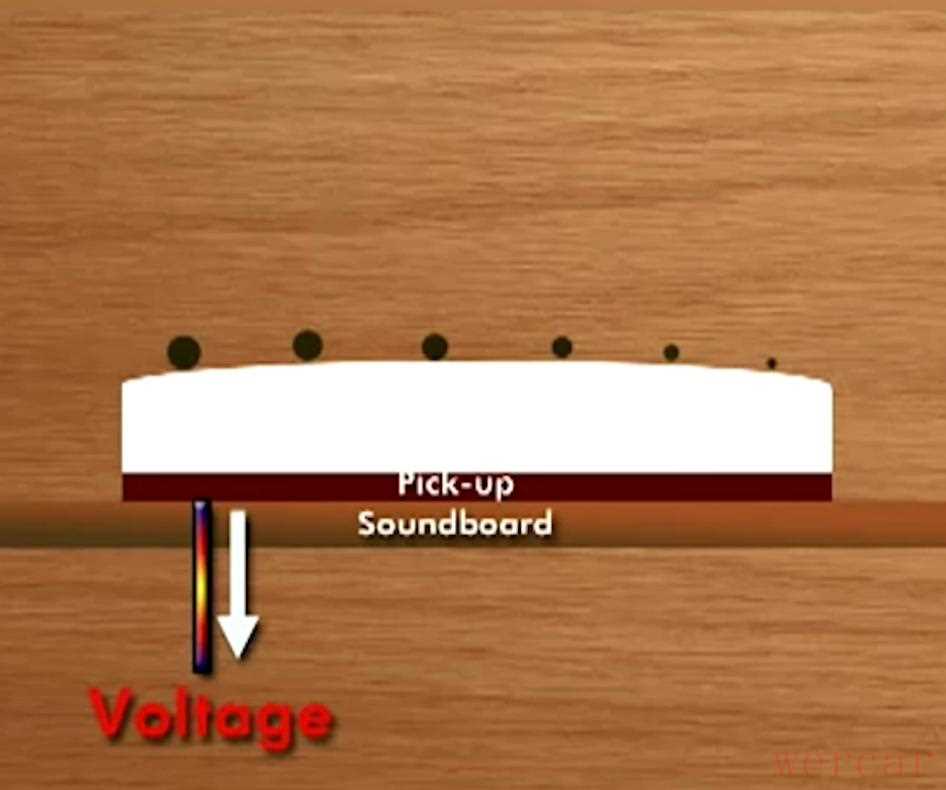 下弦枕式拾音器别名压感拾音器、压条拾音器、压电拾音器。不管是压感压条、还是压电,它们指的都是同一件事,就是在下弦枕的下面埋一根压感条。琴弦振动传到弦枕,通过弦枕传导到压感条,以此来拾取振动信号。