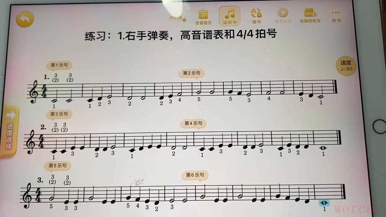 ·来看一下练习的第一条:右手弹奏高音谱表和40拍号。这里总共有三条,上面标注的代表的是手指的指法,可以用二指、三指,也可以用一指。