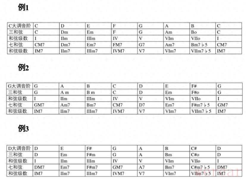 以下写出了3个调的顺阶三和弦以及七和弦,其他调以此类推,每个