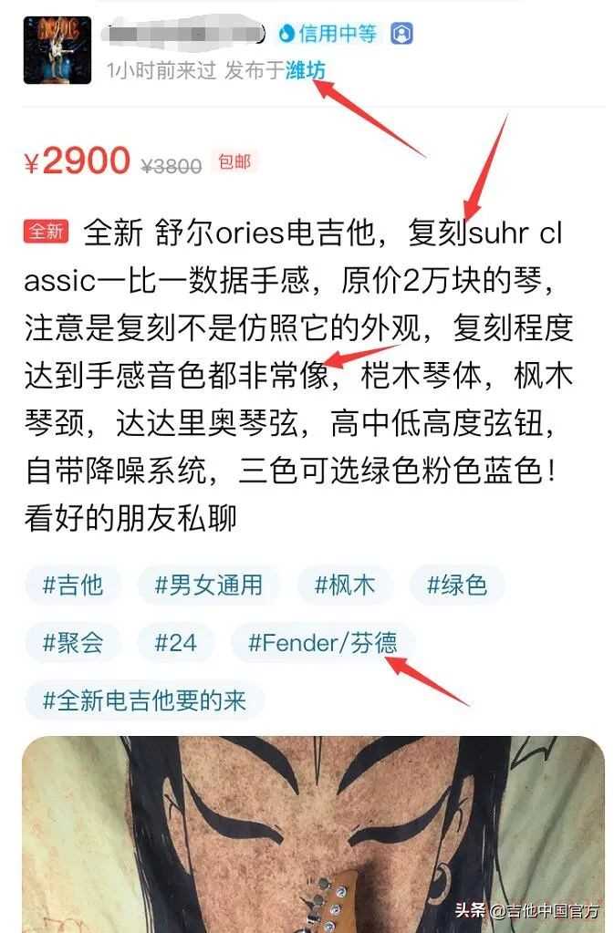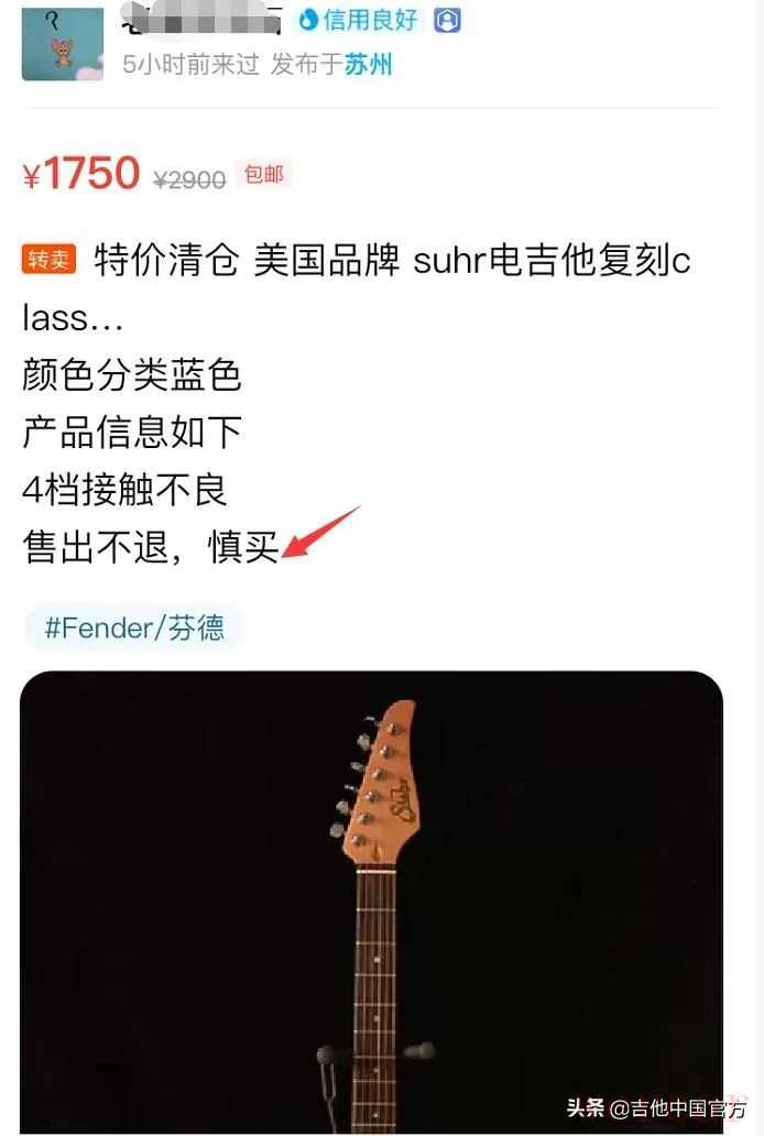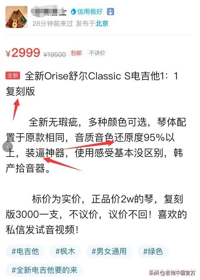 全民打假第1波:想不到假琴这么猖狂了!怪不得GC 二手论坛被杀干净了~ 经用户举报,咸鱼这假琴也太猖獗了吧!复刻?就是赤裸裸的假琴啊!只有自己的牌子才能复刻,你们都有SUHR标啊? 这是咸鱼的。最近会频繁发布,还有某音也都有一大批。欢迎大家回复 截图举报,只要人人打假,卖假琴的就不会这么嚣张!天上不会掉馅饼,卖假用假都是吉他人之耻。SUHR中国总代理魔方乐器 也将联合行动!