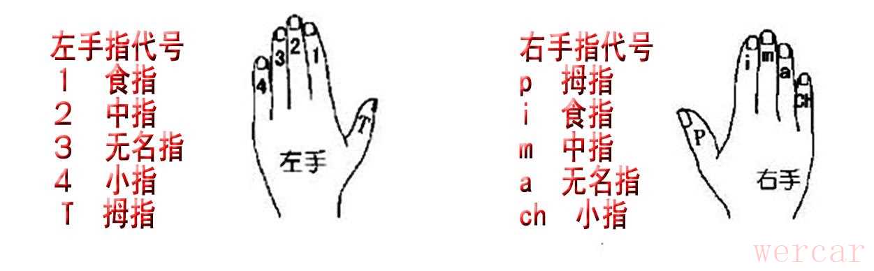 左手从1到4为食指、中指、无名指和小指,而大拇指为T。不是从大拇指开始数的。
