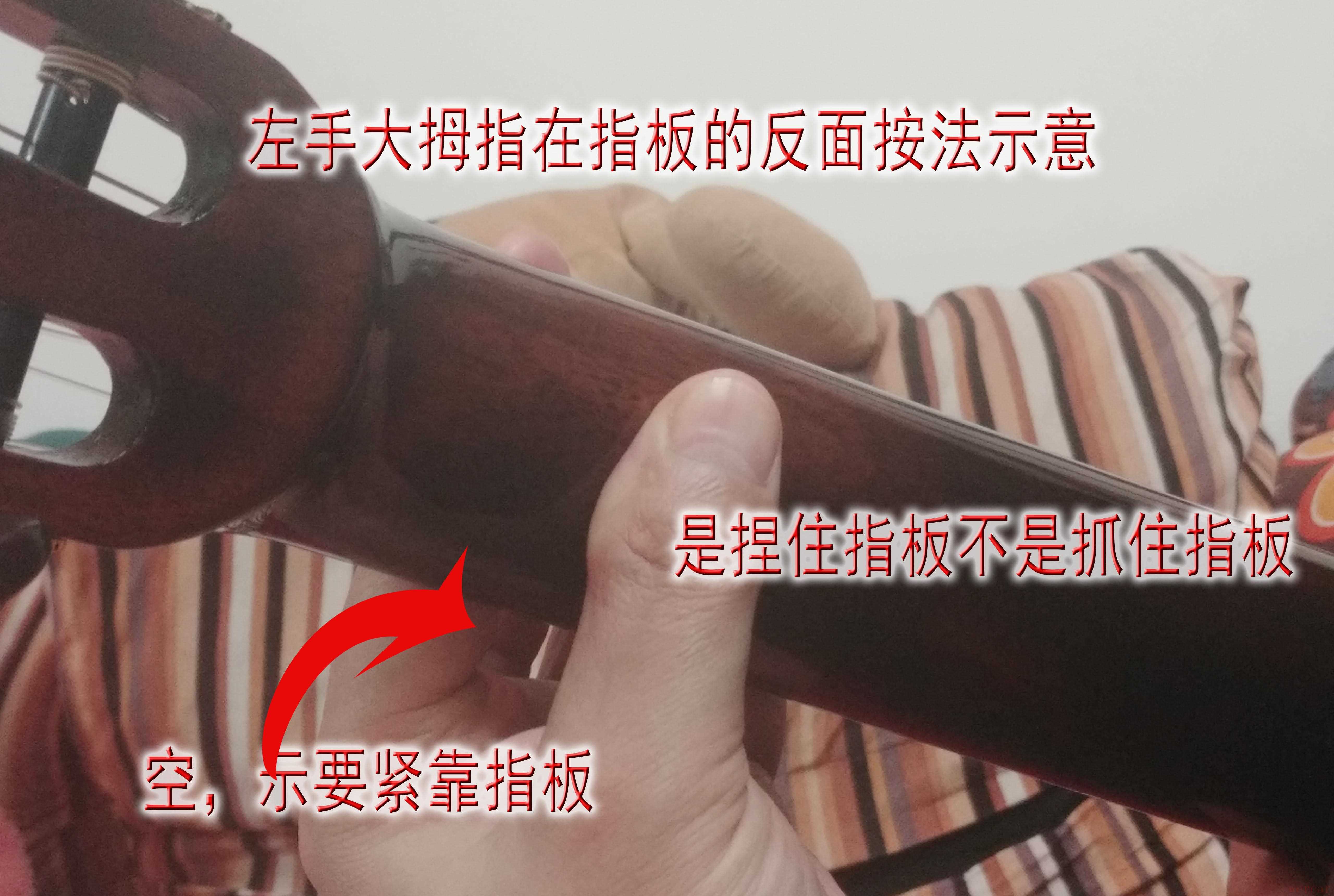 如上图是吉他左手按弦的大拇指图示,是捏住指板,不是抓住指板。看上面红箭头。手握成空心样式,虎口不要靠近指板。