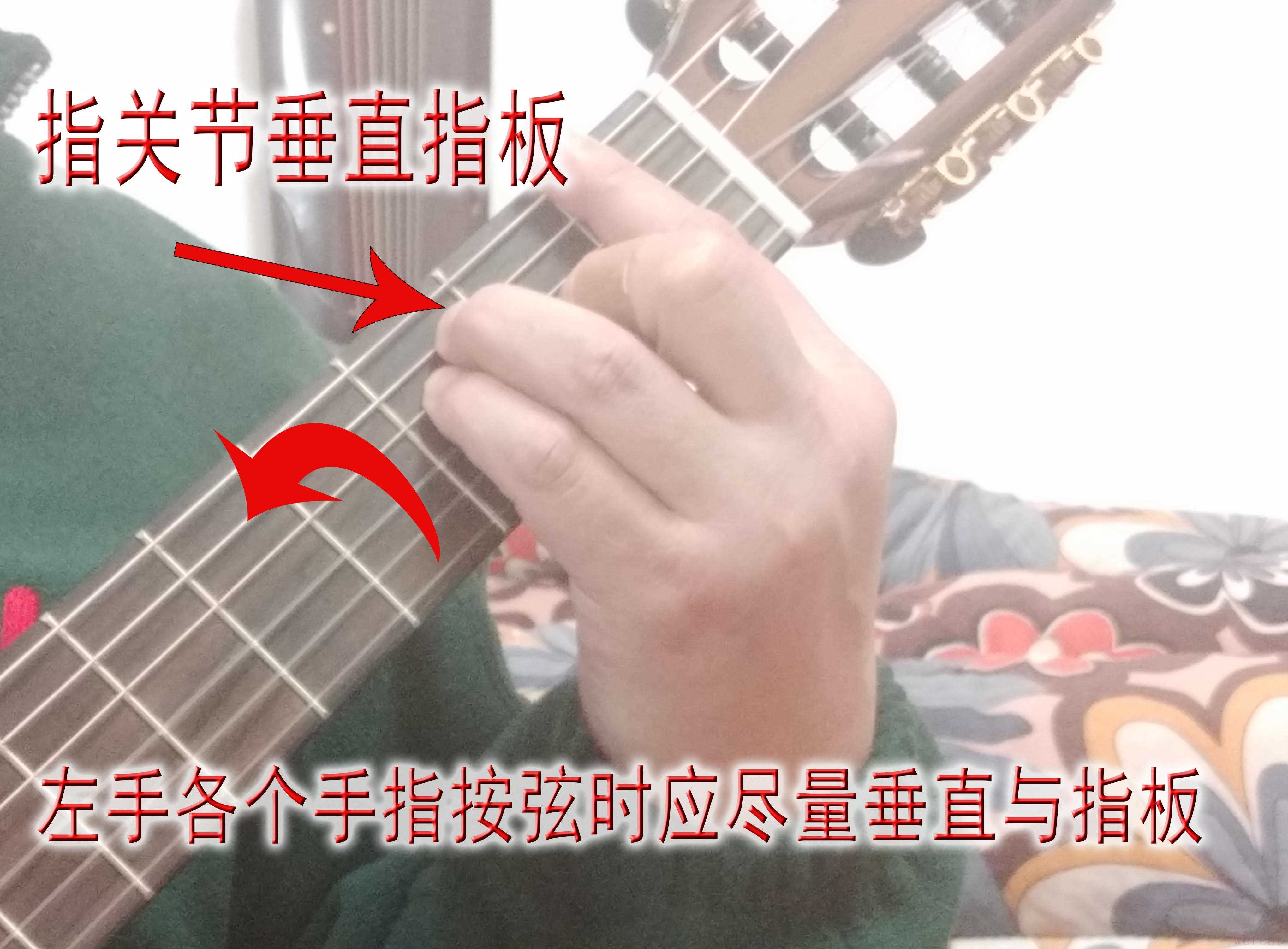 左手指按弦时应尽量垂直于指板,如上图所示,不是整个手指垂直,是各个手指的前指关节与指板垂直。就是左手握空自然样式时,前面指关节如上图红箭头所示一样,尽量垂直指板即可。