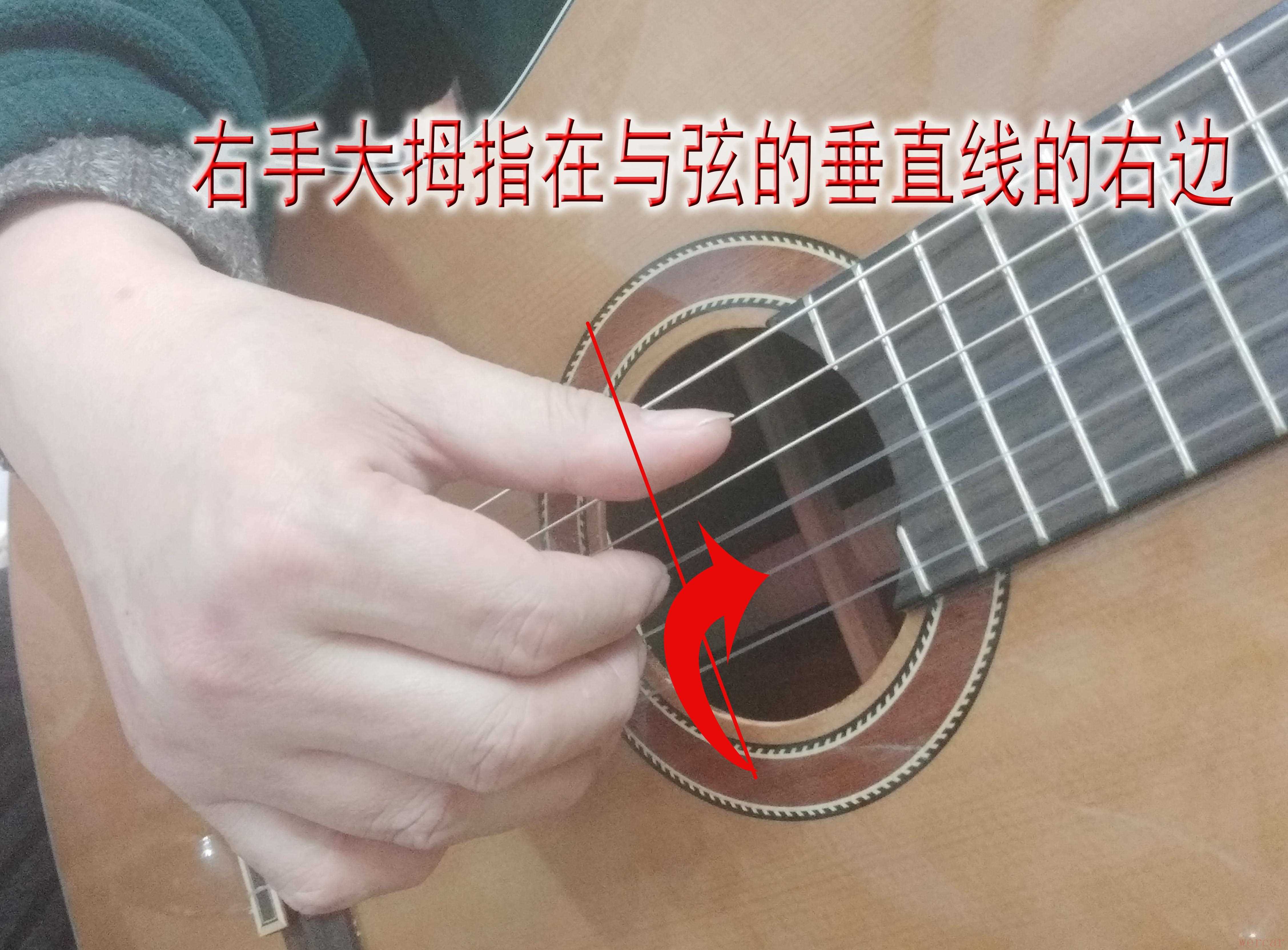 右手大拇指如上图示,要和其它手指错开,就是大拇指在红线的右手过去,其它手指在红线的左边。简单理解就是大拇指下拨弦时不要和其它手指上拨弦时相遇。