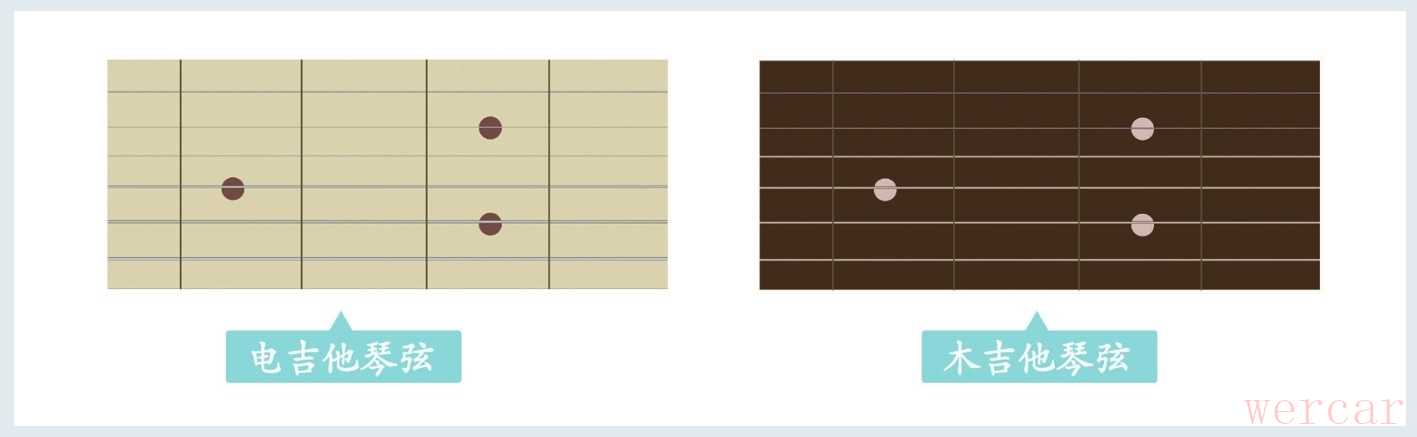 电吉他使用的琴弦要比木吉他细很多,因为电吉他弹奏经常使用推弦、颤音等技巧,而木吉他为了得到尽可能响亮而厚实清晰的音色,所以一般使用比较粗的琴弦。电吉他通常使用的是09、10型号的琴弦,1~3弦为钢丝弦,4~6弦为外表缠有一圈铜或其他材质的钢丝弦;木吉他通常使用的是11、12、13型号的琴弦,1~2弦为钢丝弦,3~6弦为外表缠有一圈铜或其他材质的钢丝弦。