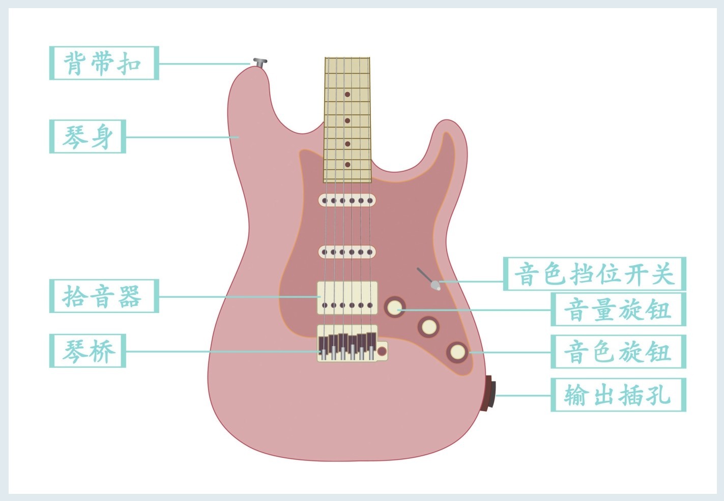 这一部分通常会详细图解并解释电吉他各个部件的名称和功能:
