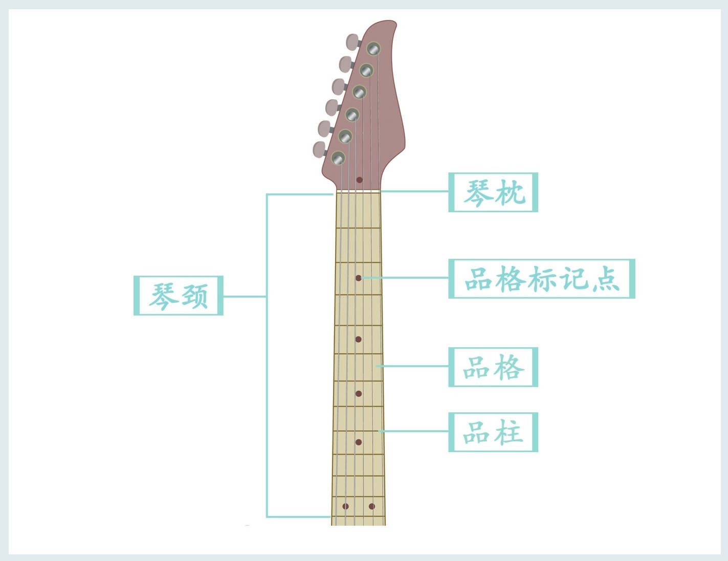 琴颈是琴头与共鸣箱的连接部分,背面为弧形,表面镶有琴枕、品格以及品格标记点。