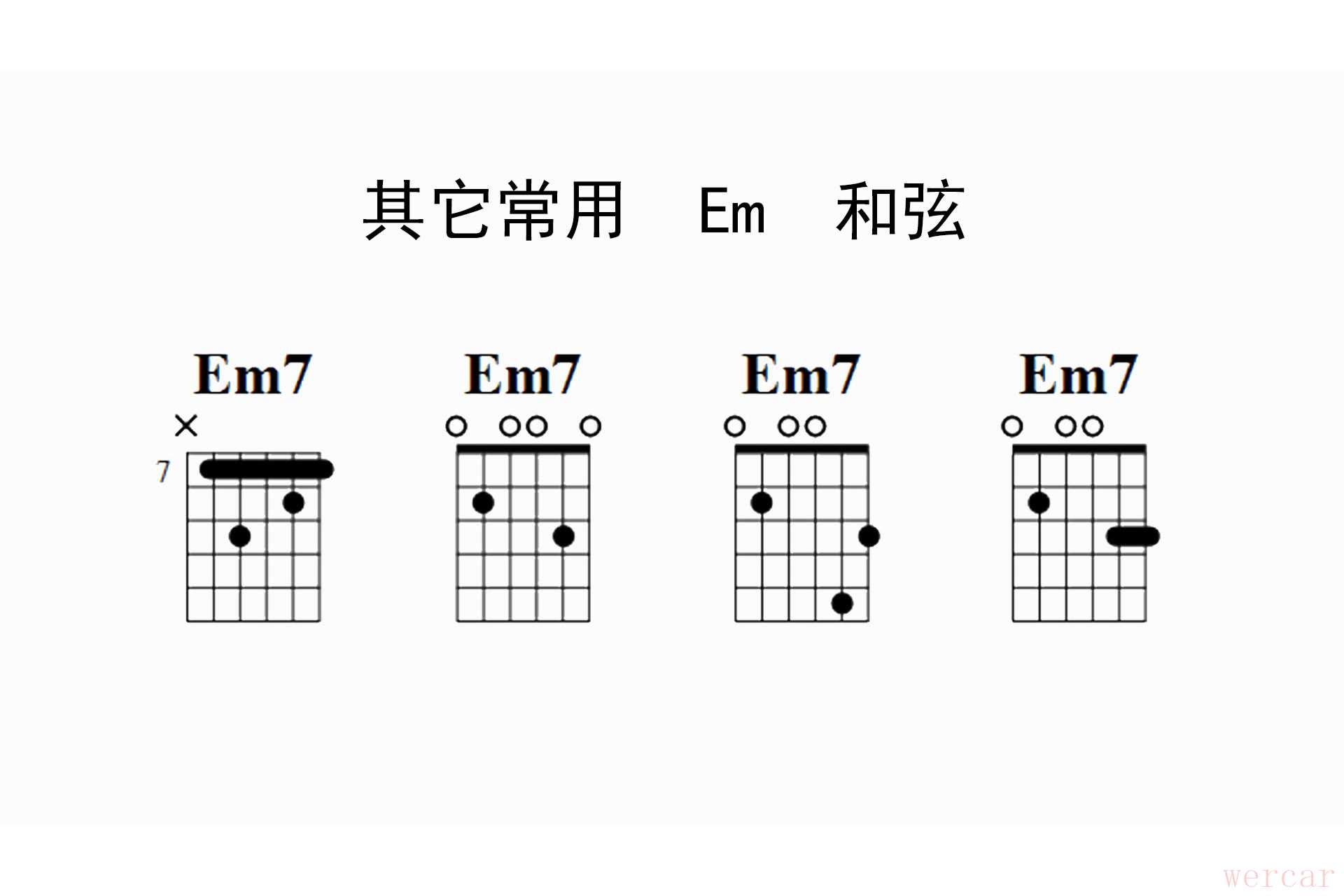 吉他上面Em7和弦有几十种按法,除了上面常用的Em7和弦以外,我还整理了几个其它次常用Em7和弦分享给大家。