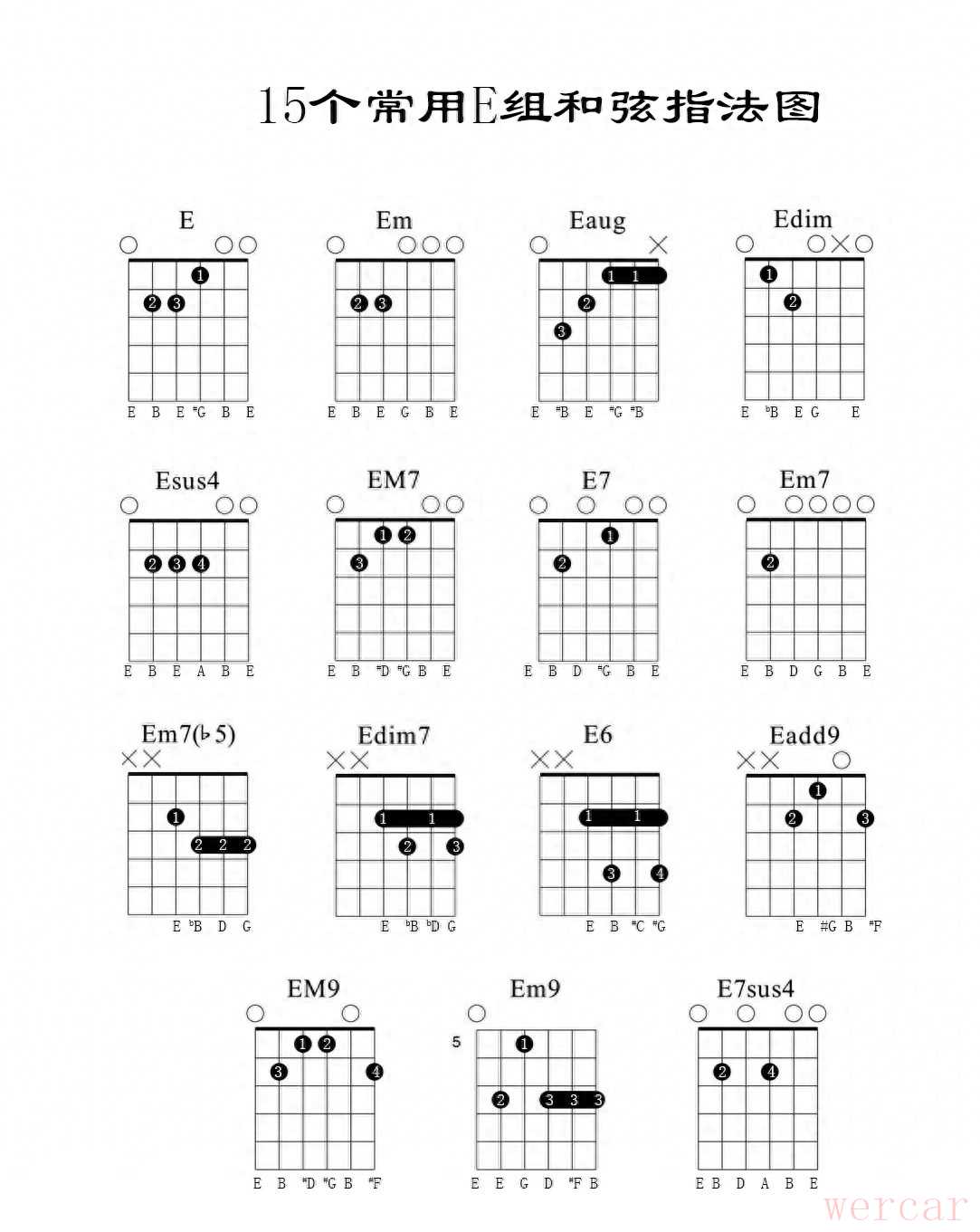 以下是十五个常用的E组和弦指法图及练习说明。E组和弦通常指的是以E为根音的七和弦,最常见的是E大七和弦(Emaj7)和E小七和弦(E7),但也可以指E小和弦(Em)和E属七和弦(E7)等其他和弦类型。这里我们主要关注E大七和弦(Emaj7)和E小七和弦(Em),并辅以一些变体。