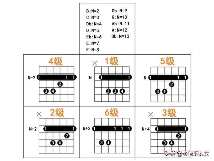 只是实际运用时D手型、C手型、G手型、Dm手型大横按比较困难,不好按,运用少,其余四种是用的最多的,详见文章最后一张图。