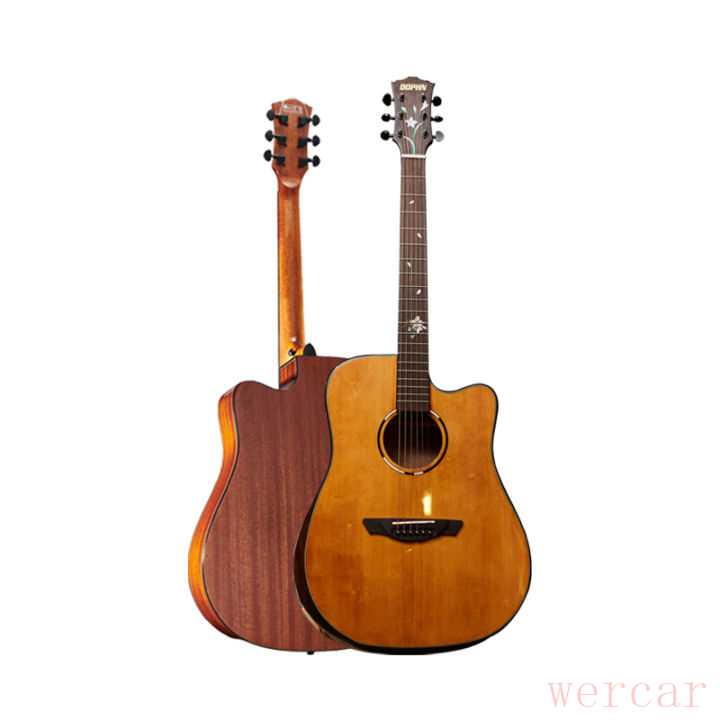 "全木吉他 (Solid Top):" 这是“真材实料”的典型代表。面板(Top)通常是整块实木,如雪松 (Cedar)、枫木 (Maple)、花梨木 (Rosewood) 等。实木面板通常能提供更丰富、动态更大、更有呼吸感的音色。