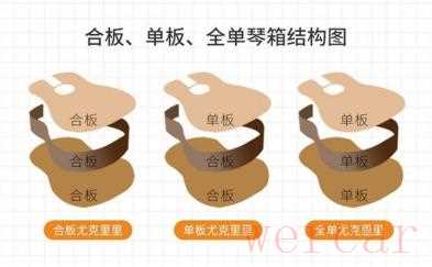 单板和合板的不同搭配,又将尤克里里类型分为合板、面单和全单。