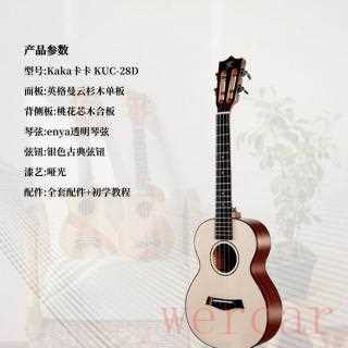 Gorilla歌芮拉主要从事西洋弦乐器的研发与制作,在尤克里里之乡惠阳有生产基地。这款GUC-2001是一款全桃花芯面单尤克里里,搭配的是碳素琴弦,音色和手感都不错,采用的是古典琴头,比较惊艳。就面单琴而言,性价比略低,但有较好的售后服务,还是比较贴心的。卡卡Kaka KUC-28D 参考价:580元
