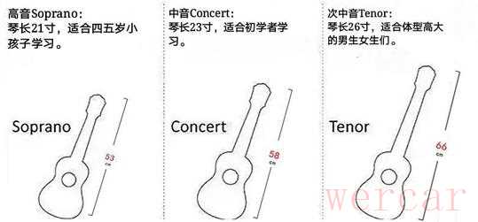 尤克里里主要有4种尺寸:21英寸、23英寸、25英寸和26英寸。