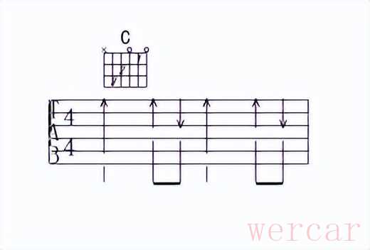 如上图所示,左手按好C和弦指法,右手扫弦的动作分别为:下 下上 下 下上。没有符尾的是四分音符弹奏1拍,有符尾连写的是八分音符弹奏半拍。