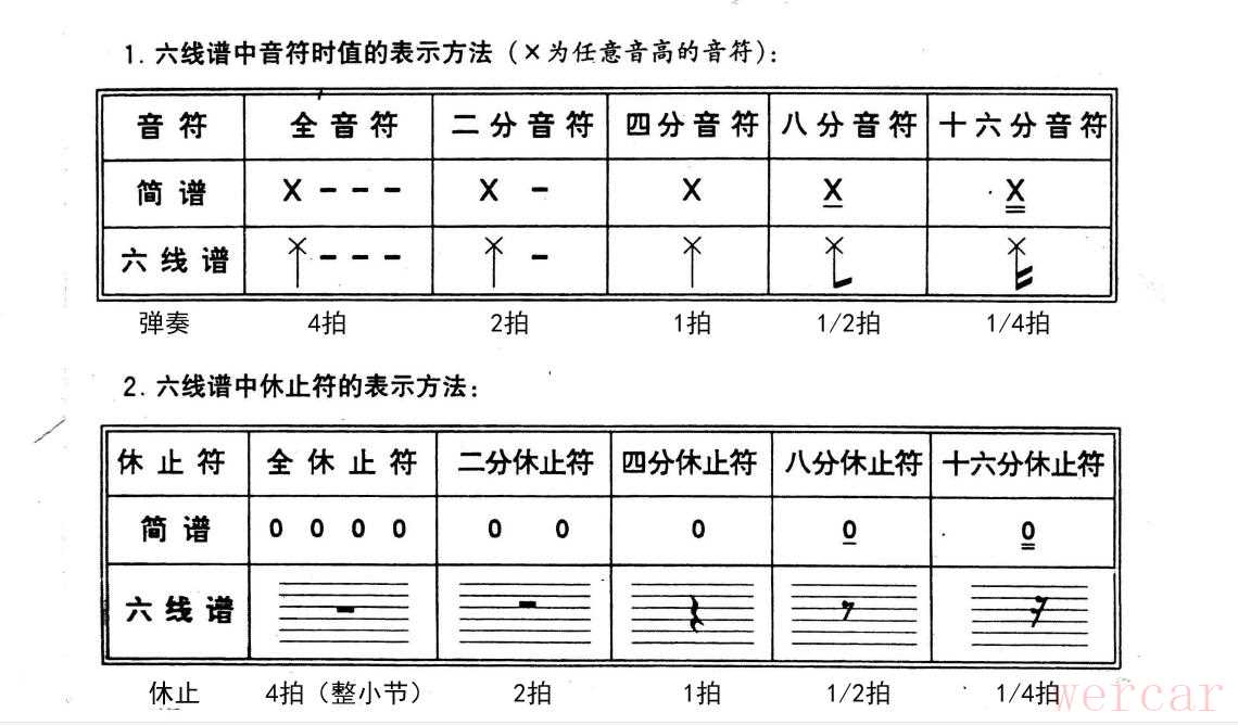 ①和简谱一样,六线谱的音符也有全音符(弹奏4拍)、二分音符(弹奏2拍)、四分音符(弹奏1拍)、八分音符(弹奏1/2拍)、十六分音符(1/4拍)