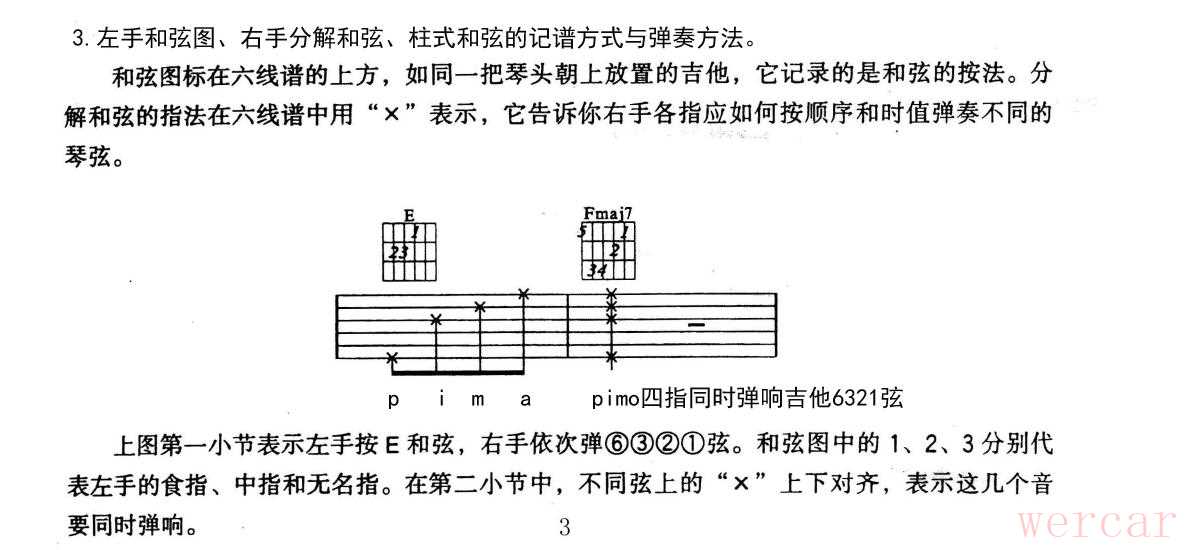 如上图所示,第一小节左手按好E和弦指法,右手分别用pima指(右手的大拇指、食指、中指、小指)分别弹响6、3、2、1弦,每个音弹奏(八分音符)半拍的时值。第二小节左手按好Fmaj7和弦指法,右手用pima四根手指同时弹响6321弦,弹奏(二分音符)二拍的时值。
