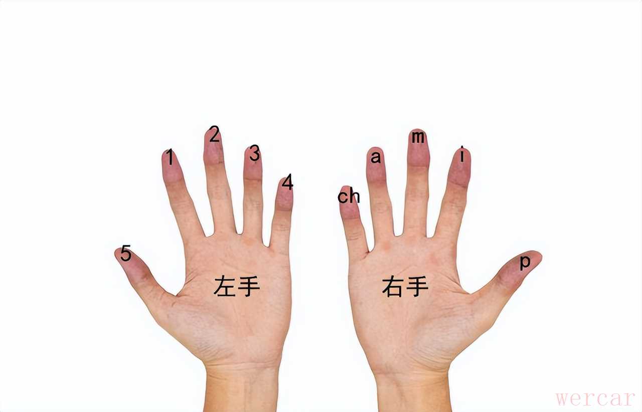 ①左手的和弦图会写在六线谱(6条线)的上面,表示我们正在看一把琴头朝上放置的吉他,默认是前三品。和弦图的竖线表示琴弦,从左至右分别是吉他的6至1弦。从上至下表示琴品,从上至下表示1至3品。和弦图上的数字表示左手手指的名称:1234分别是左手的食指、中指、无名指、小指、5指是左手的大拇指。