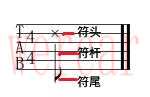 六线谱中音符的3部分组成:符头、符杆、符尾。