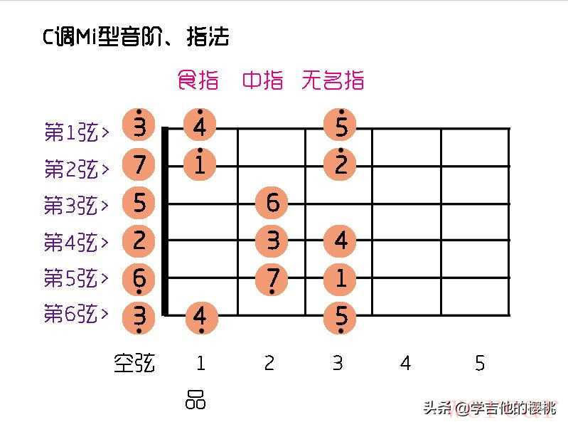 首先用钢琴或者口琴把吉他1弦定为基本调(即C调的E音)。
